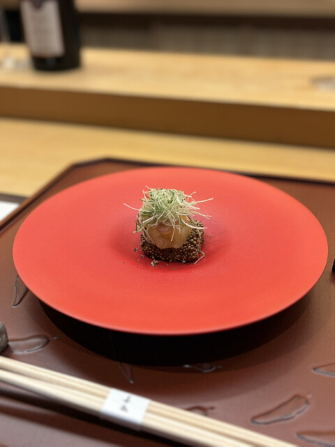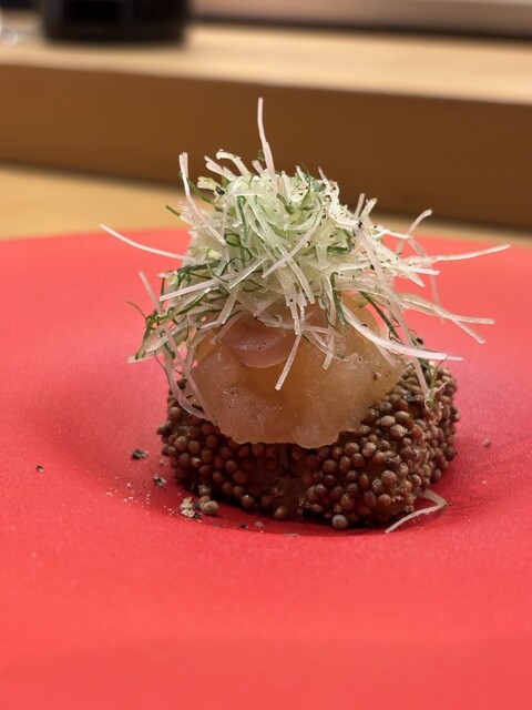 ◆クンチェーナンプラー 牡丹海老×発酵青マンゴー 一品目から完全に心を奪われた。 ナンプラーに漬けた牡丹海老の濃厚な旨みに、自家製の発酵青マンゴーがシャキッと酸を添える。 上には艶やかな卵、下には梨とバイマックル出汁のジュレ、さらに焼き茄子のピューレが静かに広がる。 口に入れた瞬間、南国の風が吹き抜け、 「うわ、これもうすごい」と思わず声が漏れた。