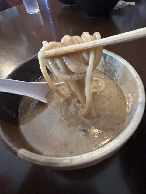 濃厚なスープに細麺がよく絡みます。