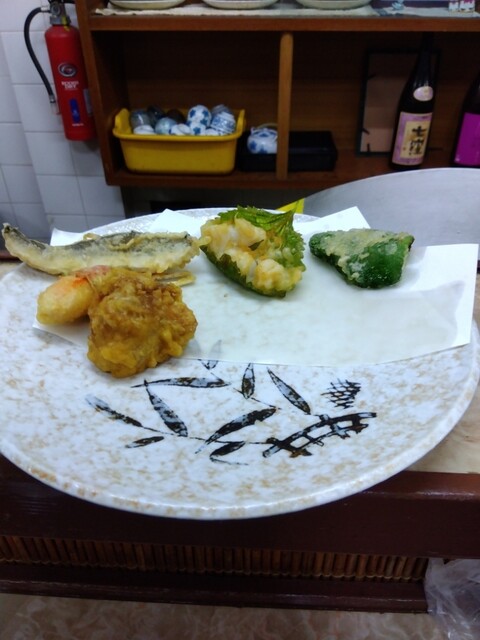 天ぷらの盛り合わせを注文。鯵、南瓜、茄子、海老2本、オクラ、黍魚子、牡蠣、鱚、穴子、蓮根、小柱、蟹爪、烏賊、鶏、カマス、ピーマンと何と全15種類。追加でピーマンとオクラをおかわり。一つ一つのサイズは小さめで多品種少量が食べられます。カラッと系の仕上がりで、天つゆでいただきます。鶏は鶏天よりも唐揚げに近い感じでした。鰺や牡蠣、カマスといったあたりが特に印象に残りました。