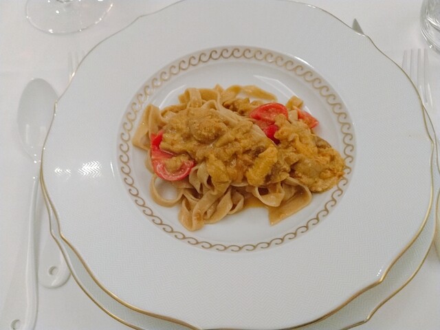●手打ちパスタ、紫雲丹、フルーツトマト