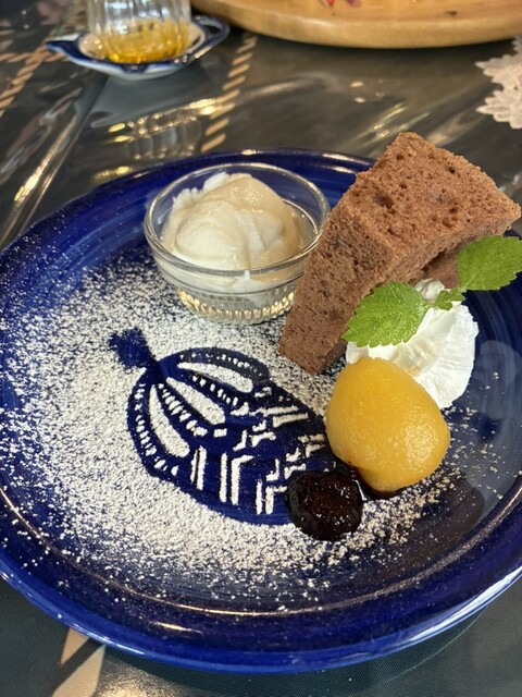 デザートはホイップクリームとスポンジケーキに、アプリコットのコンポート、バニラアイスのセット