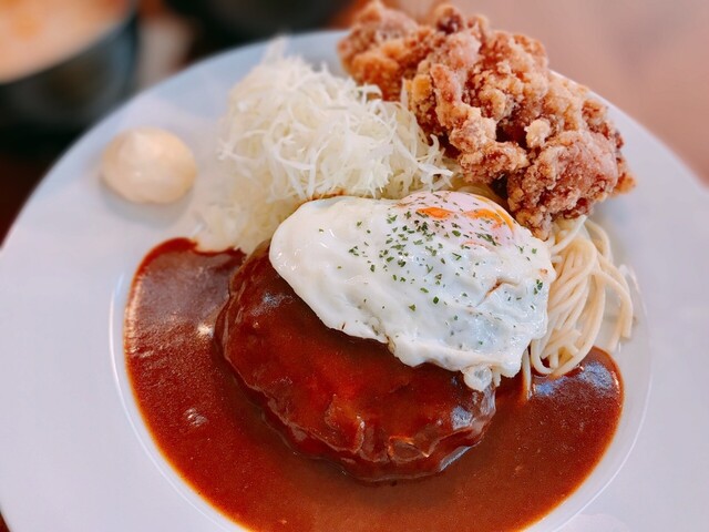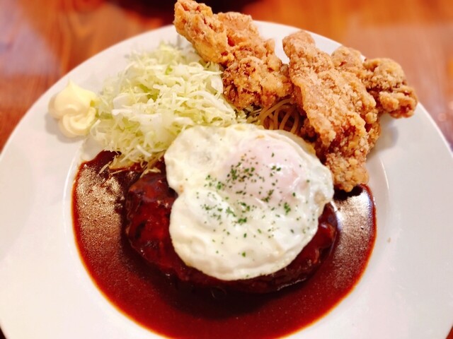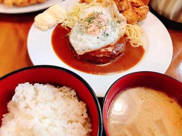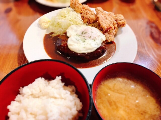 本日はいつもの通り、ハンバーグ&唐揚げ&目玉焼き定食をオーダー。さすがの行列店だけあって速攻で提供されます。と言っても料理は冷めているわけではなく熱々での提供です。