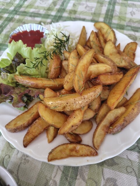 香りがポテトとよく合うし、ローズマリーも一緒に食べるとカロリーがなくなるような錯覚に…。