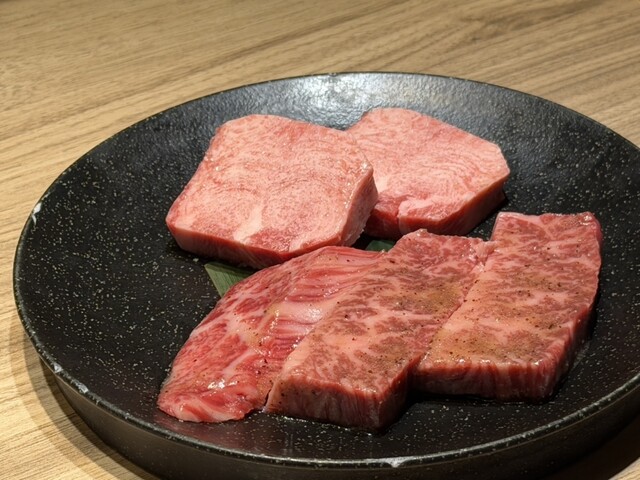 今回はもっと色々な料理を試したくて、ディナーのコースを選びました。ちょうど秋の季節なので、秋のコースにしました。タルタルは本当に美味しくて、これが名物の理由がよくわかります。お肉の質も素晴らしく、どの料理もスタッフの方がその場で調理してくれるのがいいですね。私は料理が下手で、いつもビーフをウェルダンにしちゃうんですけど、それが助かります。スタッフさんはとても親切で、調理の腕も抜群。厚切り牛タンはレア気味に火が通っていて、中がピンク色でジューシーでした。