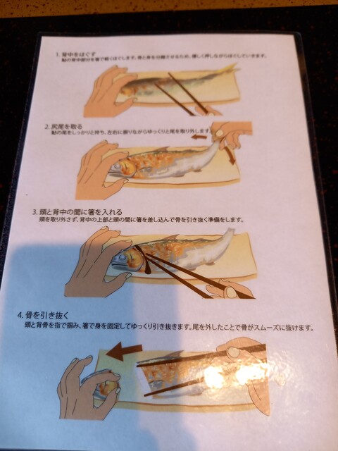 しばらく待つと、塩焼き以外の料理が運ばれてきます。その後すぐに焼きあがった塩焼きが運ばれてきました。テーブル上に鮎の塩焼きの食べ方(骨の抜き方)が書かれたプレートが置かれていたのですが、店員さんが「頭から食べることが出来ますよ」と言ってくれました。