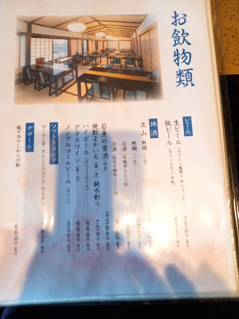 お店に入って名前を告げると座敷(小上がりかな)の椅子に座るテーブル席に案内されました。窓際で庄川が見えました。窓が開いていたので庄川の上を通って入ってくる風が少し冷たく感じられました。座敷には床に直接座る席もありましたが、そちらには客を通していませんでした。あと、座敷ではないテーブル席もあるようでした。