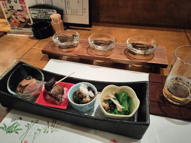やっぱり日本酒でしょということで、ハートランドで口を湿らせたらすぐに利き酒セットをお願い。ピッタリくる辛口を探すも上手くいかないなぁ...