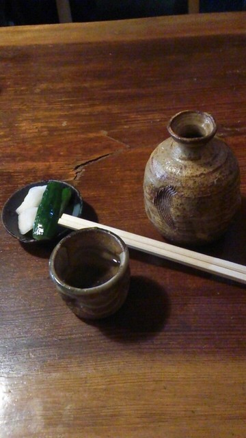 奥様が注文をとりに来たので、焼味噌(@370円)、熱燗(@550円)、後でせいろ(@550円)と言うところを、田舎蕎麦(@580円)を頼みました。前の方が頼んだのを聞いて、つられて注文してしまったのでした。細打ちが好きで、田舎蕎麦はあまり好みではないのですが。