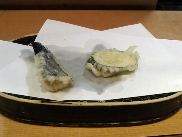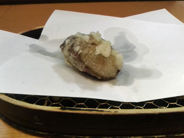 そして来ました一品目、カウンターに置かれた敷き紙に乗せられます。カウンターは揚げたてを頂けるのがいいよねー ・・・でも猫舌なんだけど(笑) 以下順番に。