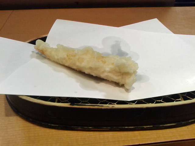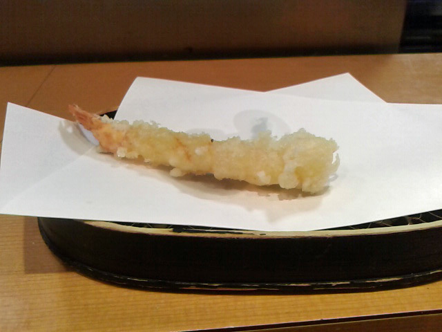 海老(1本目) 大きくもなく小さくもない。揚げ方が絶妙。透明の身が白くなりかけの熱の入り方。海老の甘みを感じます。