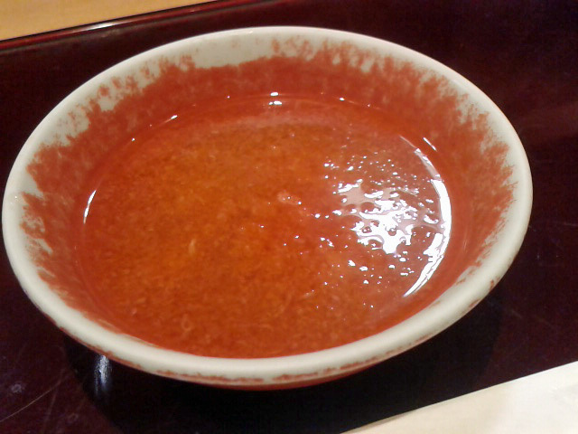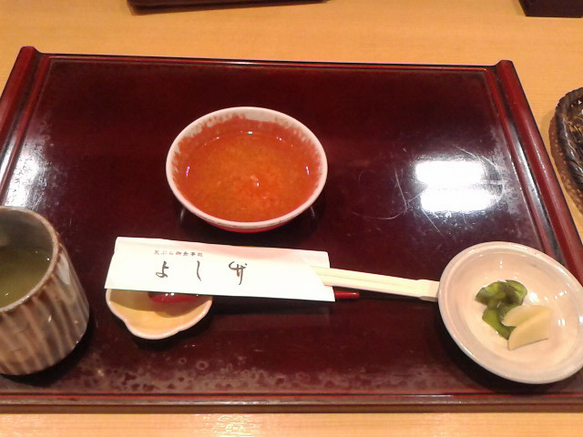 大将から「もうちょっと待ってて下さいね」と、そりゃまだ営業時間にもなってないものなぁ、がっついてすんません(´・ω・`) 目の前に手際よく箸とスプーン、お茶の湯呑に香の物、天つゆと並べられていきます。天つゆには紅葉おろしが入ってますね。ご飯と味噌汁が来ます。ご飯はほんの少しww 炊立てだからかすげー美味しいけど。 お味噌汁も少なめ、具は刻み揚げ、ワカメ、大根、人参、あと三葉かな? (ご飯と味噌汁の写真撮り忘れたなw)