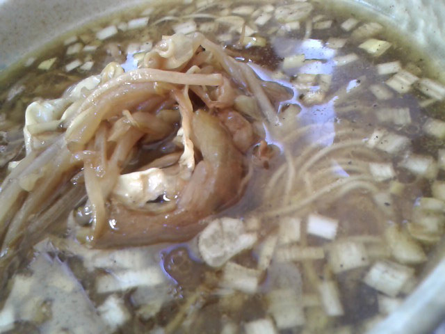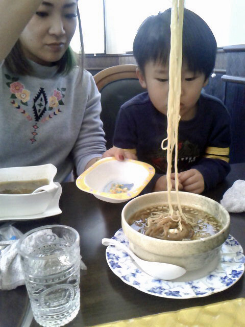 最後に「醤油ラーメン」です。こりゃスゲー細い麺だなー。上には焼豚と一緒に炒めた甘い玉ねぎが乗ってますよ。スープ表面に脂が張り、あっさりとした中にもコクを出しています。下の孫が「旨い旨い」と喰ってましたが、途中から「辛い」と言いだしまして、私が頂いたんですが、結構荒挽き胡椒が入っていたんですな。大人にゃ丁度いいですけど、お子ちゃまにはまだ無理かぁ。