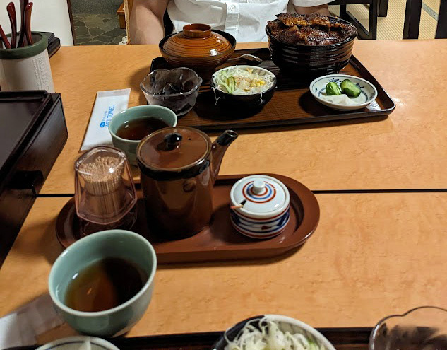 通されたのは奥の座敷です。最近は何処も畳敷きにテーブルとイスになっちゃいましたねぇ。足の悪い方には良いんでしょうが、風情が失われて行きますな。オーダーは二人とも「特上丼(7切)@4800」の大盛り(+¥150)に。 他の方のオーダー聞いてますと上丼が一番出てる様ですな。 すぐに満席に人気ですねぇ。