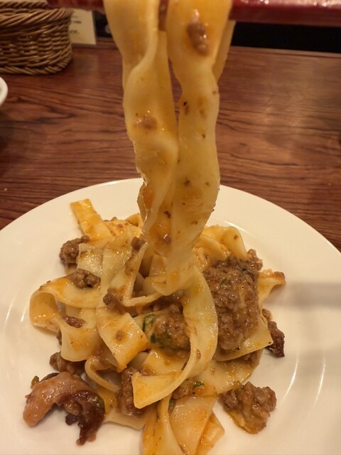 ボロネーゼのフィットチーネは平打ち麺でもちっとした食感。