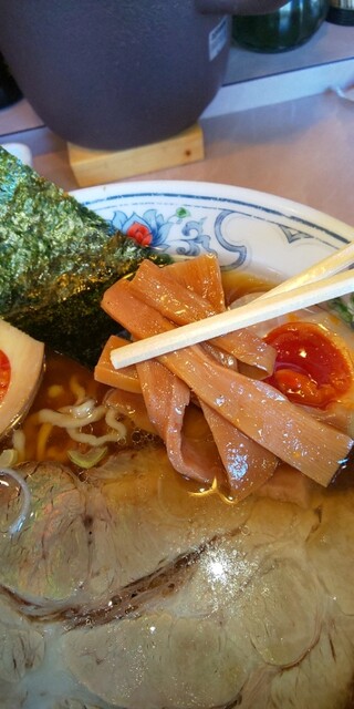 透明感があるスープと逆に見えたのが、具材(チャーシュー、メンマ)と、麺の色で、何となく暗く、焦げ茶色がより黒に近くなった様な、そんな不思議な印象を受けました。