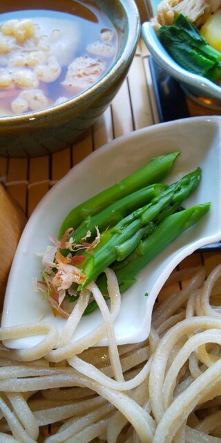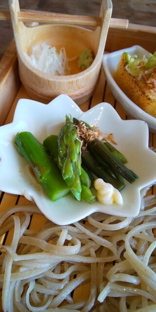 アスパラガス用にマヨネーズが添えられて、蕨には鰹節が乗って、同様に醤油かめんつゆ的な味が付いて。