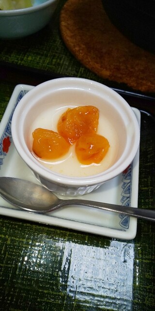 牛鍋に付くデザート(さくらんぼ煮が乗った牛乳寒天)(R4.12.26撮影)
