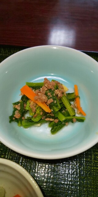 小鉢は、挽肉と小松菜、人参等との炒め煮。