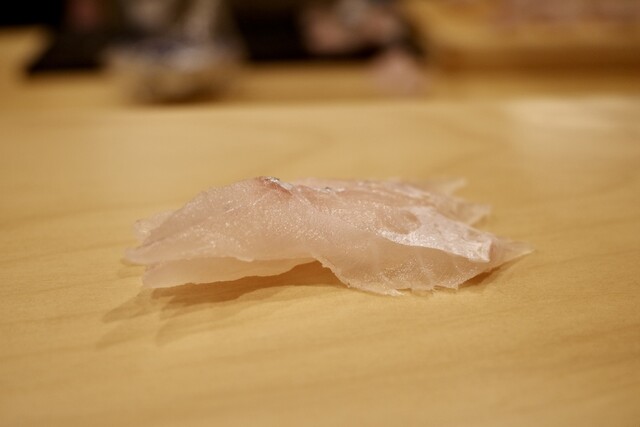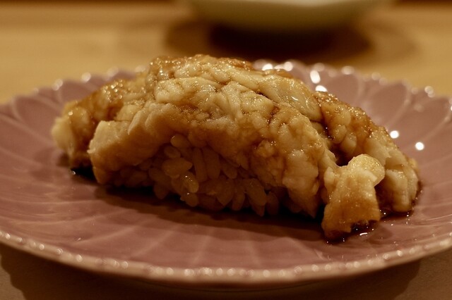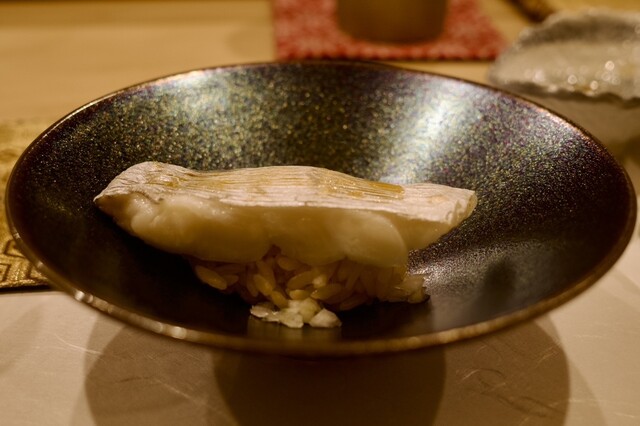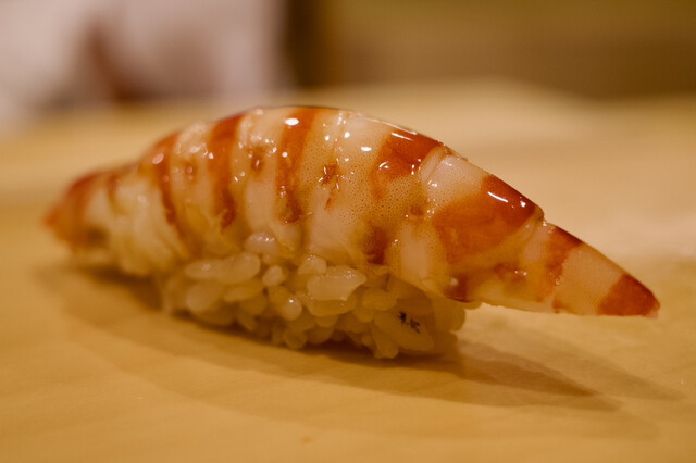 この日のスペシャリテは石川県のガス海老。牡丹海老のようなねっとり感と甘海老のような甘さを兼ね備えたガス海老は痛むのが早くすぐにガスのような臭さが出るためこのような呼ばれ方をしている。流通はほとんど産地が中心とされていて、都内では滅多にお目にかかれないガス海老だが、産地との交流のある当店ではとても美味しい物が頂ける。本当に最高だ。また、他の握りも美味しく、始めに出てきたつまみなども酒の進む一品であり、本当に満足した。以下、コース内容。