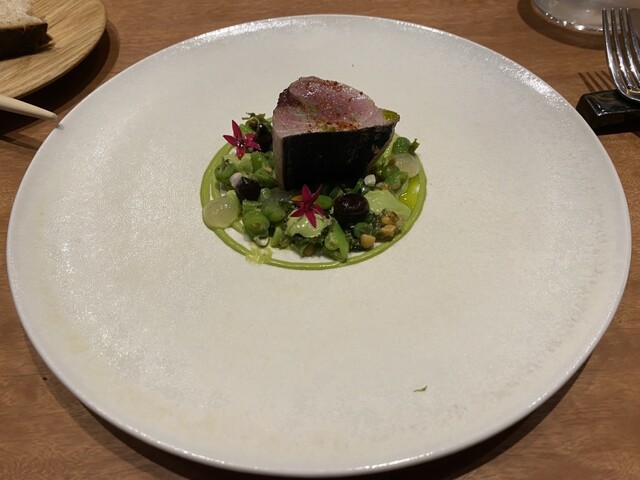 最初はパンとお手製の海藻バターですがこれからもう美味しいです。魚介はお店で熟成していてカルパッチョや低温調理で出してくれます。魚のメインはスズキでトマトとの相性がよく、お肉のメインは鴨で付け合わせはビーツと野菜の使い方が大好きです。