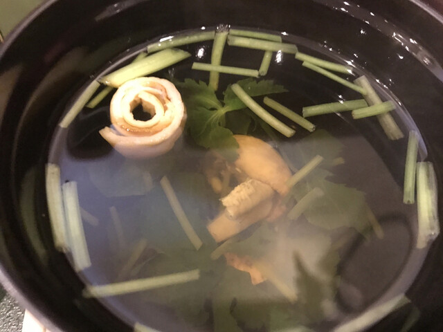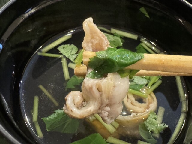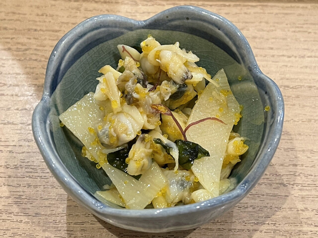先ず、ビールとお通しで喉を潤し待つことに…お通しは、アサリと筍とワカメと数の子を甘めに炊いたもので、美味しい。