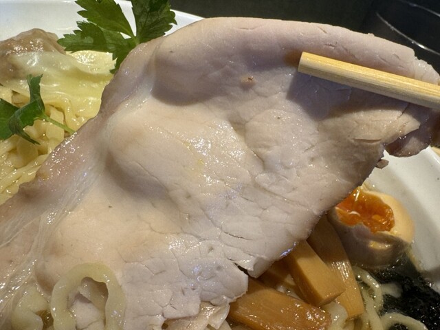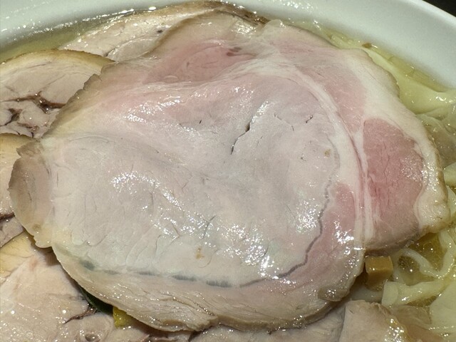 折り畳まれた低温調理チャーシューと、その下にバラチャーシュー、透き通った琥珀色のスープ。