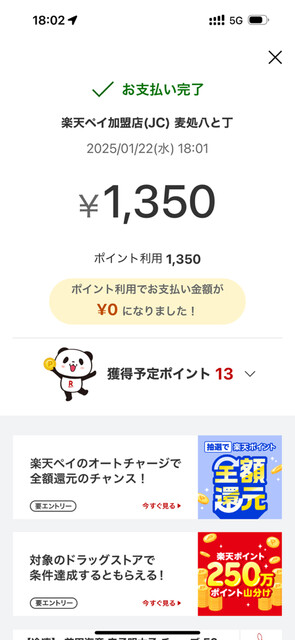 決済は楽天ペイ(期間限定ポイントで実質無料)