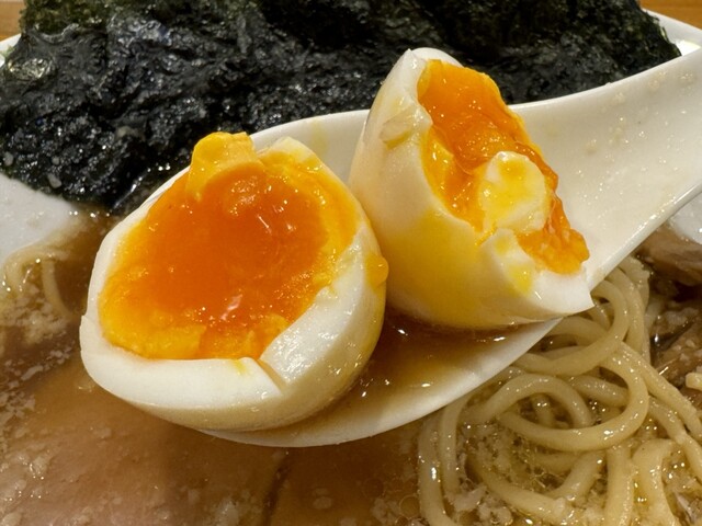 大判で分厚いチャーシューが3枚、つみれ2個、増しメンマに味玉は燻製だと黄色がかってたけど、塩は白い。