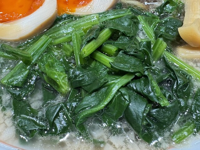 前回は、チャーシュー背脂中華のみだったけど、今回は味玉と追加ほうれん草を追加しよう。