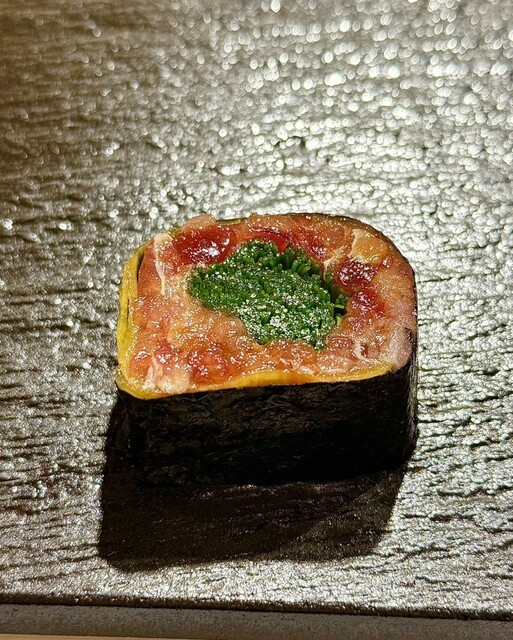 とろける雲丹の食感を損なわず香りを活かすために,海苔の佃煮をシャリに混ぜ込んだ雲丹の握り