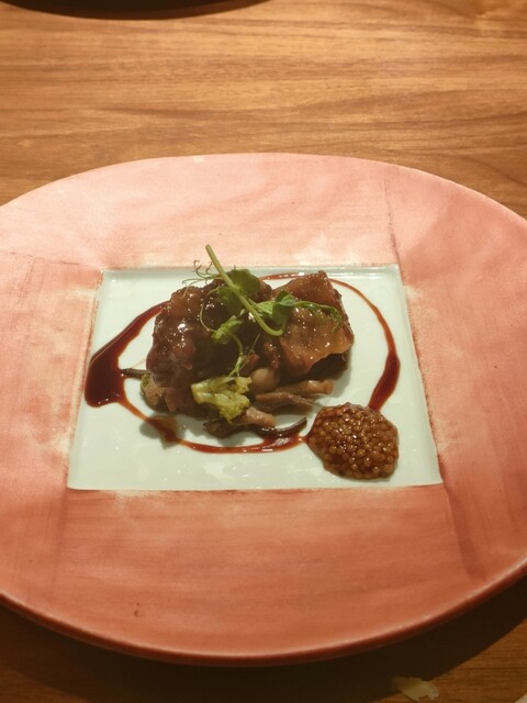 その上にズッキーニやスナップえんどう、キノコ等の野菜に煮凍りの付いた柔らかく煮込まれたお肉が美味しく見た目も美しく味もソースごとにそれぞれ特徴があってスタートから楽しませてくれました。