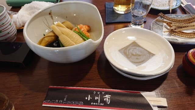 鰻の上と骨せんべい、きも焼き、若竹煮にコエドの瑠璃(生)を注文。