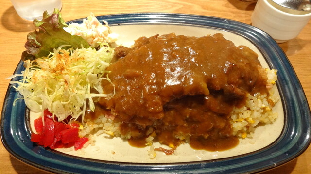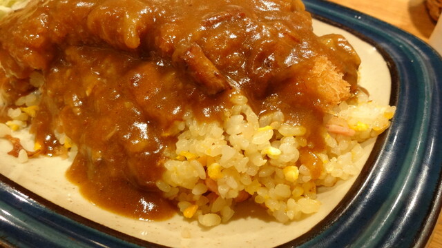 チャーハンの上にカツをのせて、その上にカレーがかかっています(*゚Д゚*)