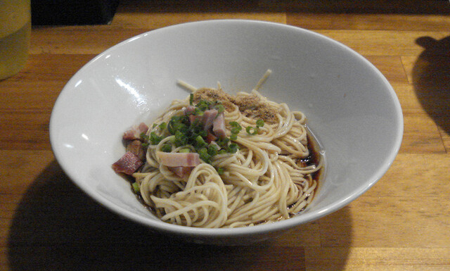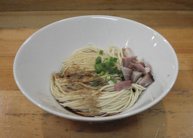 開店前に着いて、列が縮んでいって、煮干ソバ730円(s)塩味を頼んだ。