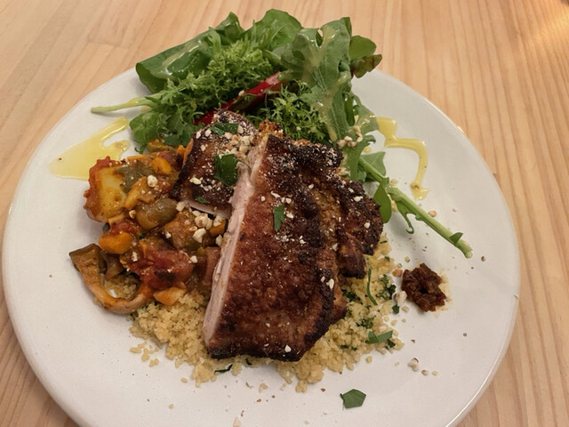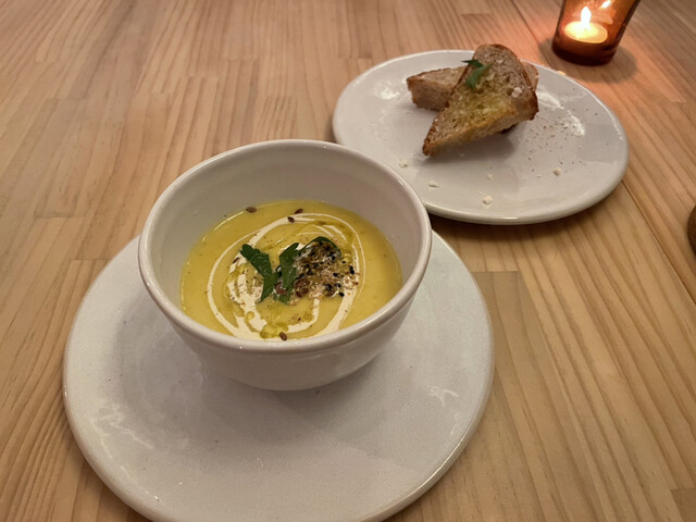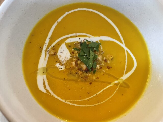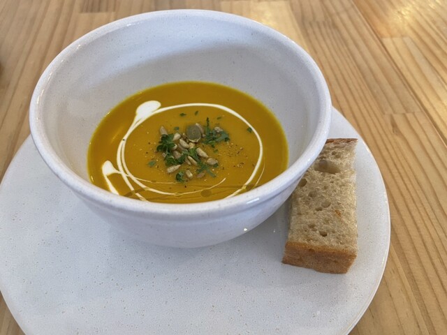 この日のチキン料理はバーベキューチキンメルトでした。スープはにんじんのスープで、ほんのり生姜の風味がして美味しかったです。