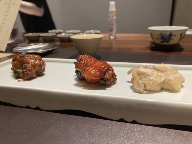 フカヒレ春巻きにナマコの腸粉ぽい餃子に茶碗蒸しのリピート系。