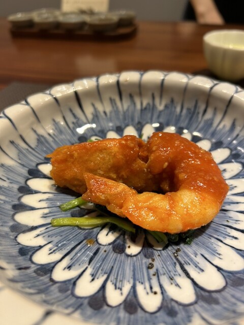 タマゴの皮に海老の餡、トマトソースがピリ辛で要するにエビチリ