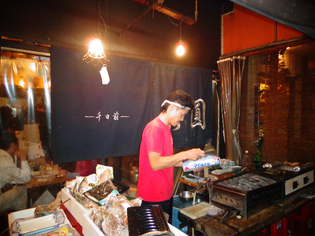 店外では 魚貝を焼いている 立ち食いで 人が寄ってきていた