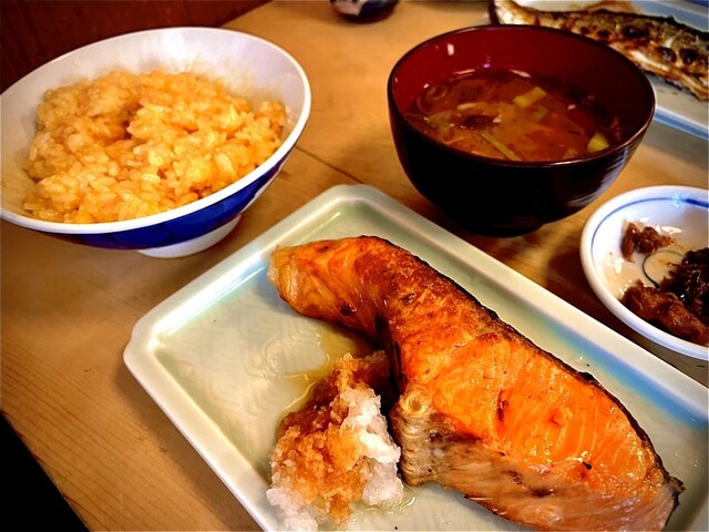 主役のしゃけ焼きは、いつも期待を裏切らない肉厚さで、口の中でとろけるような脂の乗りが最高に美味しい。添えられたマグロの甘辛煮がこれまた絶品で、白いご飯が進む進む!卵かけご飯で心も体も満たされる最高のランチ体験です。