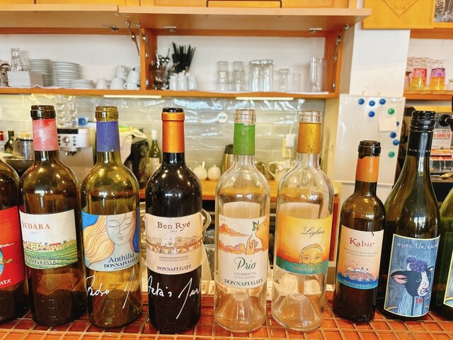また、店内に絵本作家の谷口智則さんのイラストが壁に描かれていたり、絵が飾られていたり、カウンター席に置かれているワインボトルのラベルにもイラストが載せられていたり、子連れママには感度が高くこだわりを感じられます。