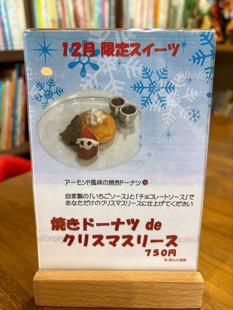 12月限定スイーツ 焼きドーナツ de クリスマスリース(750円)と、絵本おじいちゃんとパンにちなんだトースト(700円)を注文しました。マシュマロチョコトースト、シュガーバタートーストの2種類を半分ずつにしました。