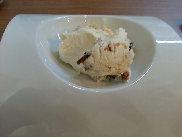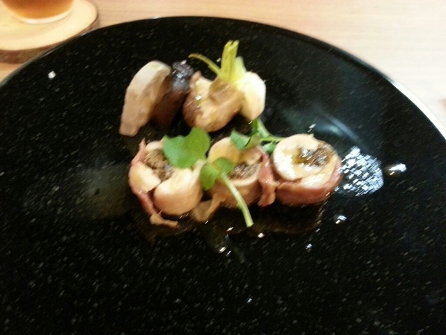 黒のお皿に白っぽいウサギをくるっとまいて、輪切りにしたものが出てきました。ウサギは淡泊だけど、あまりソースが濃いと何の肉食べてるかわかんなくなっちゃうんだけど、こういう風に、ハム(燻製?)を外側に巻いて中にきのこを入れて焼いてあると風味がすごくいい!そして、ソースはあくまでもあっさり。けっこう感動的でした。