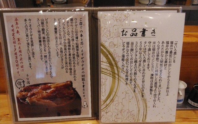 実は、昔から、鰻の蒲焼きは私の町内の「梅田魚屋」さん、うな重の出前は「喜久屋」さん、そして鰻のせいろは「うな信」さんと決めております。ということで福井市にある「「うな信」さんへ行きまして、カウンターに一人で寂しく座らせていただき、さっそく大奮発「鰻の大蒸しせいろ」3,500円を注文致しました。