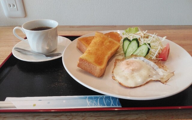 ほどよい間の美でモーニングサービスが登場しました。大きな白い皿には、モーニング定番のトースト・サラダ・目玉焼きが、綺麗に配置されてました。見ただけで心が落ち着きます。最初は喉を潤すためにアメリカンをひとくち、非常に飲みやすい。そしてサラダ⇨トースト⇨目玉焼きを三角食べしました。味逢いながらママさんに色色とお聞きしました。