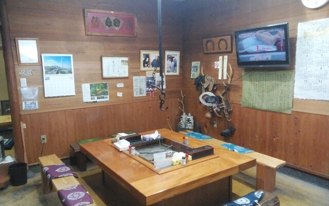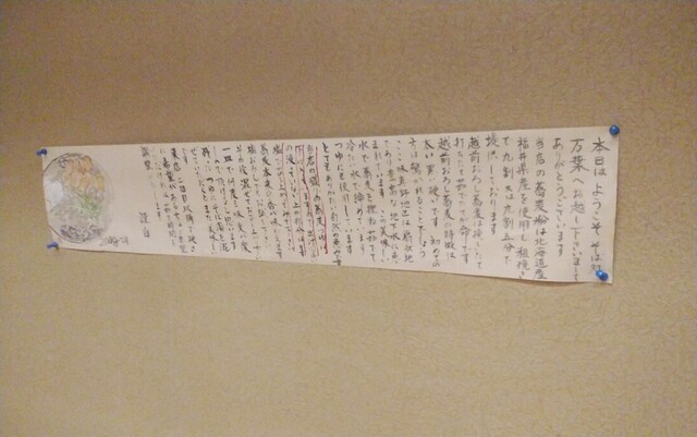 いったん、囲炉裏のひとつの席に陣取ってから、受け取ったお茶をひとくちふくんだ後、店内を探ってますと、店内の3箇所に貼ってあるお店の説明に、『本日はようこそ そば処万葉へお越し下さいまして ありがとうございます・・・・』と手書きで掲示してありました。