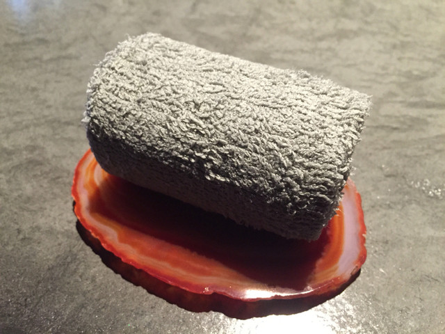 アミューズには茄子の一口サイズのシュー。前のお店のオリーブのアミューズを思い起こさせます。茄子の皮を黒くなるまで焼いて練り込んだ黒い皮の中には柔らかい茄子が入っています。中の茄子がとろけて熱々、皮はもちもちしていました。