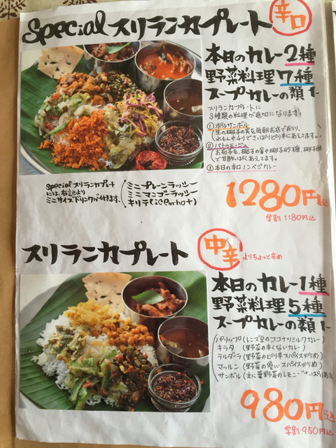 さて、いただいたのはスペシャルスリランカプレート1280円。ドリンク込みなので、ホットのキリテにしていただきました。あと、娘のためにミニラッシー100円(価格が良心的すぎる!)も。