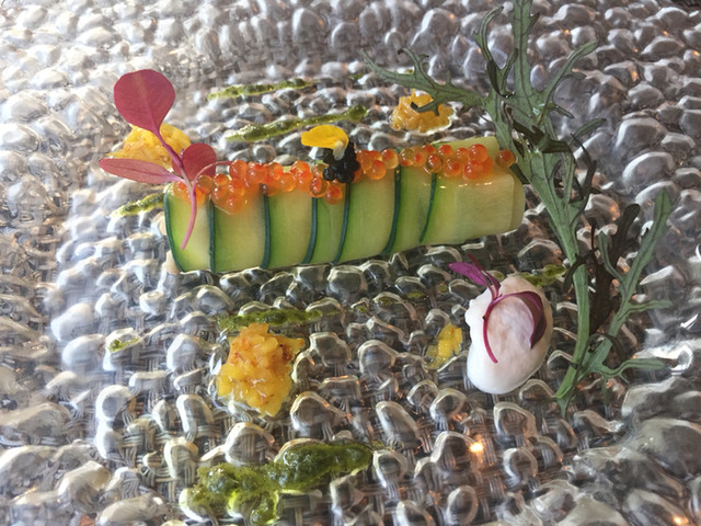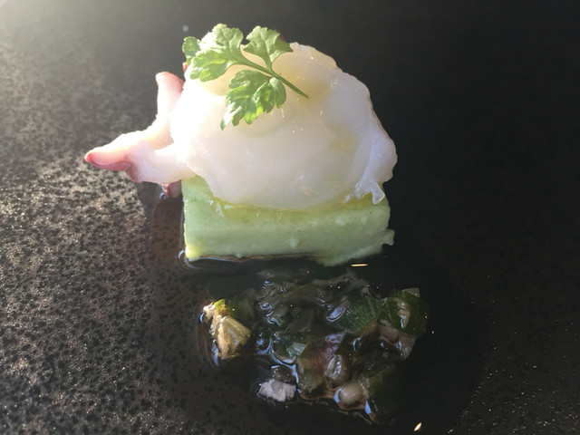 薄切りのズッキーニでズワイガニ、ボタンエビ、カワハギがカネロニのように巻かれていて、とても目に涼やかな前菜。西洋ワサビやクリームチーズでいただきます。魚介の掛け合わせの妙が素晴らしい。わずかに口の中でねっとりとしていいバランスです。