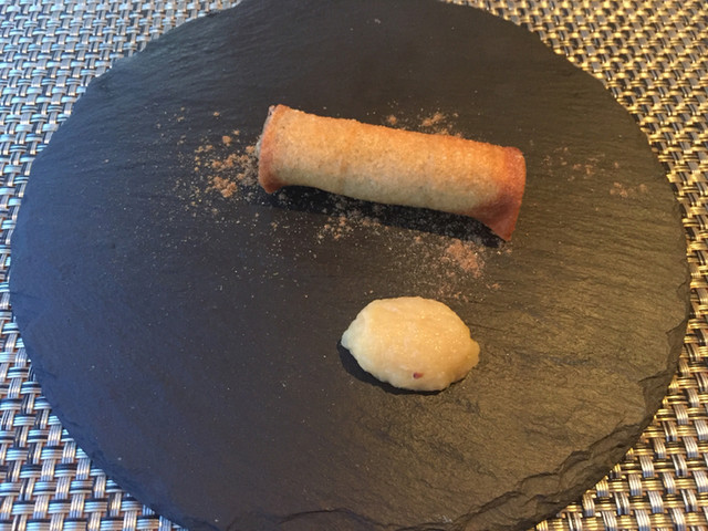 ここでなんとブーダンノワール!とってもスムースな口当たりのブーダンノワールが春巻きにきっちりと巻かれて。リンゴのピューレとの相性は言わずもがな。お魚の調理の素晴らしいシェフ、と思いながらいただいていましたが、お肉系も素晴らしい。シェフ、腕が良すぎます!