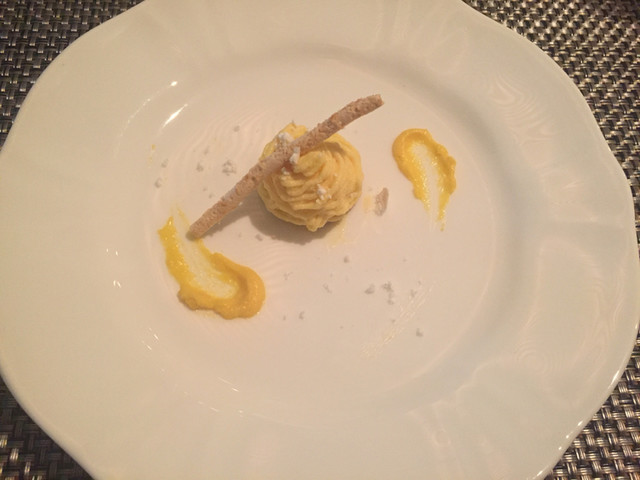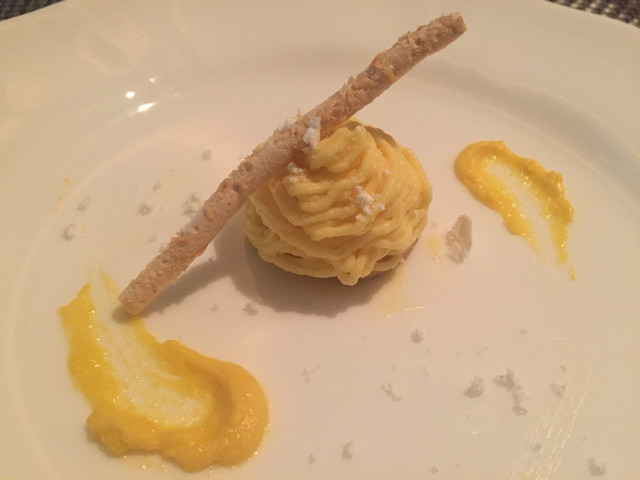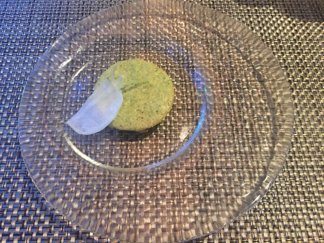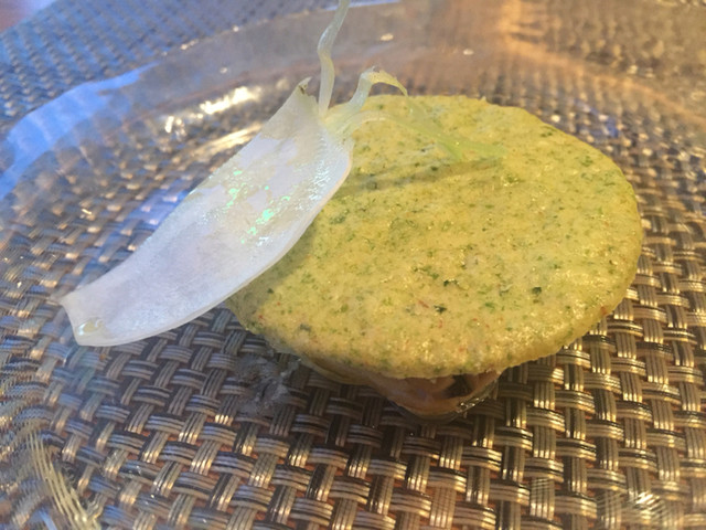 ジュレの上にサブレが乗ってます。青海苔や生姜のためか少し和のテイストがします。サブレの軽やかなサクサクとジュレのぷるんとした食感がすごくいいハーモニーで。シェフのアイディアに脱帽です。